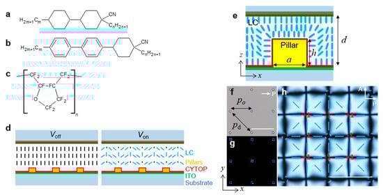 Molecular structures of materials and schematics of the LC/Pillar system: (a) CCN-mn; (b) NCB-mn; and (c) CYTOP. (d) Schematic of the LC director field at voltage off/on. (e) Schematic of LC director field and substrate structure. (f) Square array of cylindrical pillars. (g) Homeotropic LC configuration: slightly distorted LCs around pillars (brightness and contrast are adjusted for visibility). (h) LC configuration with +1 and -1 umbilical defects. P, polarizer; A, analyzer. Scale bars are 40 μm.