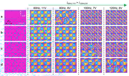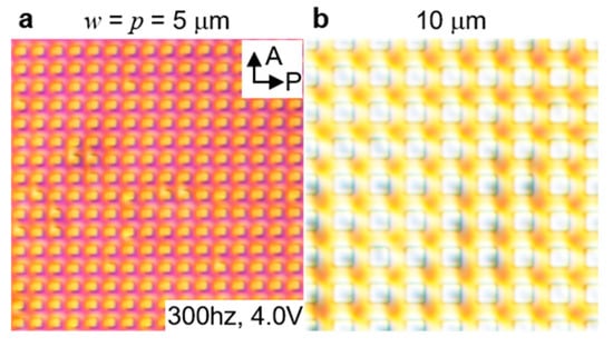 The formation of defect arrays is highly dependent on the ratio of the cell thickness d to the pillar spacing p. When p > 2d, the relation p ~ ml can be satisfied in certain ranges of voltages and frequencies. However, when p is similar to or smaller than d, no patterns are created as in the case of w = p = 5 μm in Figure 7a. With similar pillar arrays, but greater cell thicknesses, the defects do not appear. Instead, upon applying the electric field, we observed a uniform homogeneous LC alignment as d = 11 μm in Figure 7a,b, which is approximately twice as large as the cell thickness in Figure 6. In this region, although the defect array formation is suppressed, we can still see modulation of the refractive index/birefringence, with a smaller amplitude of the modulation. As expected, the LCs are uniformly aligned along the diagonal direction with respect to the pillar arrays, as also reported in other LC systems [28].