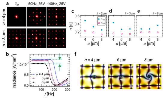 The frequency-dependent transmittance of the probe laser beam traveling through the sample cell at a fixed voltage shows how much light is scattered only by the pillars (with homeotropic LC alignment) and by the created defect patterns. Considering the voltage-off state, the pillars distort the homeotropic alignment of LC in the ground state (Figure 1e,g). If the height of the pillars is much shorter than the cell thickness, the light scattering from the pillars is negligible. For our choice of LC mixture, we have not detected any scattering by pillars shorter than 2 μm. However, bigger pillars scatter light more, which gives rise to low transmittance of the probe laser light at the voltage-off state. The green dotted lines in Figure 3b indicate the difference of optical intensity. This can also be seen in the voltage-off state in Figure 3a. For diameters up to 4 μm, the scattering from the pillar array is almost negligible, but it becomes significant for 8 μm pillars. We observed that the threshold frequency needed to induce the pattern decreases as the pillar diameter a increases (Figure 3b). A larger a implies a larger surface area of the pillars, hence a bigger total surface energy and a spontaneous alignment of the LC on the surface of the pillars. The distorted LC configuration is closer to radial around the +1 defects, also without an applied field. Thus, the required energy to reorient the LC director upon applying the electric field becomes smaller.