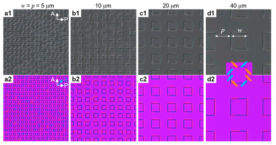We analyzed the LC director configuration under crossed polarizers and with an inserted full-wave plate. In the case of cylindrical pillars, we mostly observed 4-brushes (e.g., in Figure 1h), as expected for the radial alignment around the pillars. From square-shaped pillars, we often observed 6-brushes, as the schematic shown in Figure 4(d2). The likely reason is the sharpness of the pillars’ edges, which causes the formation and the pinning of defect lines, as shown also by Beller et al. in sharp colloids [26]. This LC distortion in the array with the shorter w and p (for instance, when w = p = 5 μm in Figure 4(a2)) propagates to the neighboring regions around the pillars. The slight light leakage in the POM image under crossed polarizers shows that the LC deformation between pillars influences the director field of the neighboring pillars.