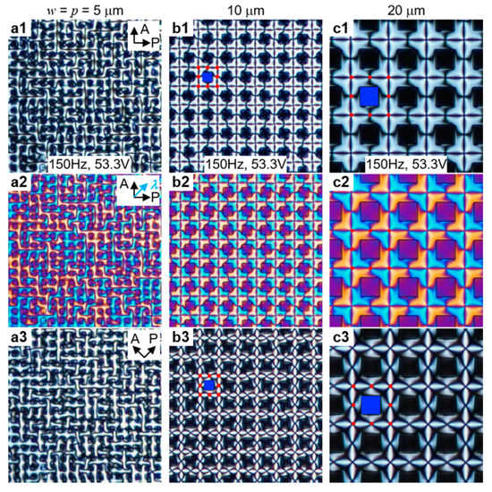 Defect array formation in square-shaped pillars with width w and spacing p of pillars observed by polarizing optical microscopy: (a) w = p = 5 μm; (b) w = p = 10 μm; and (c) w = p = 20 μm. (a1–c1) Under crossed polarizers in the orthogonal direction; (a2–c2) with a full-wave plate; and (a3–c3) in the diagonal direction. Pillar height is h = 2 μm and cell thickness is d = 5.6 μm. P, polarizer; A, analyzer; λ, full-wave plate. The red dots are umbilical defects; the blue square represents pillars.