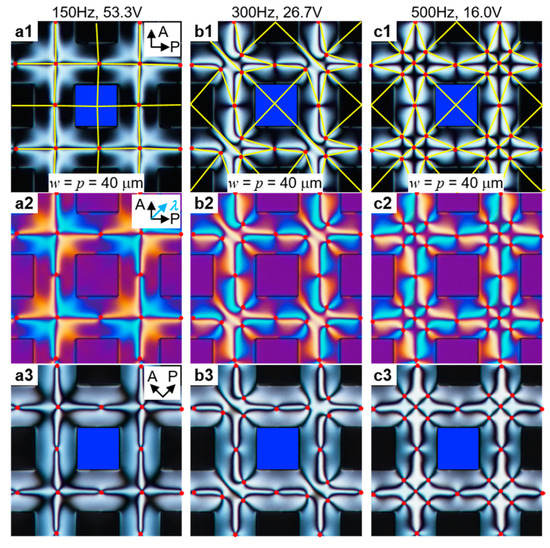 In the case of w = p = 40 μm, the defect array is able to transition between field-induced stable states. At f = 150 Hz, V = 53.3 V (Figure 6a), the defect pattern is arranged in a square array, with one defect at the intersection, similar to the array with w = p = 10, 20 μm (Figure 5b,c). The configuration obtained at a higher frequency, however, is hybrid. The areas between two pillars maintain the previous orthogonal configuration with only one defect, albeit slightly distorted as can be seen, for example, comparing that region in Figure 6(a3,c3). The areas between four pillars, instead, are occupied by defects arranged along a diagonal lattice. At intermediate frequencies and voltages, it is possible to see a clear transition region between the two states, characterized by a progressive switch from orthogonal to diagonal lattice alignment in the region between four pillars (Figure 6b). A complete switch to a square lattice with diagonal alignment would be possible by changing the pillar array lattice to a hexagonal lattice, as demonstrated by Kim et al. [27].