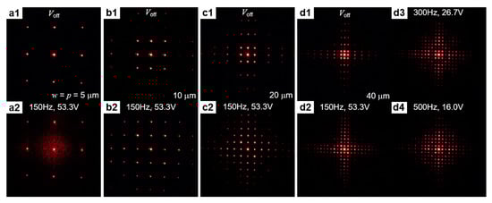 Diffraction patterns with square-shaped pillars: (a) w = p = 5; (b) w = p = 10; (c) w = p = 20; and (d) w = p = 40 μm. (a1–d1) Voltage-off state; (a2–d2) f = 150 Hz, V = 53.3 V; (d3) f = 300 Hz, V = 26.70 V; and (d4) f = 500 Hz, V = 16.0 V. Cell thickness is d = 5.6 μm and pillar height is h = 2 μm.