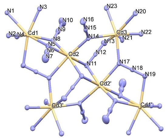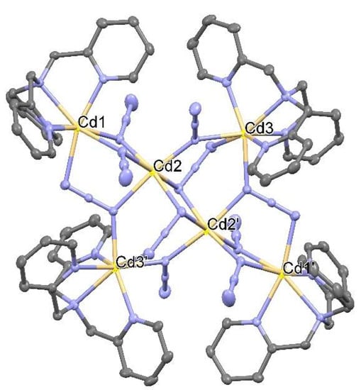 The single crystal X-ray structure analysis (Table S1, Supplementary Materials) reveals the existence of a centrosymmetric cationic [Cd6(TPA)4(μ3-1,1,3-N3)4(μ2-1,1-N3)6]2+ cluster unit (Figure 1), where the three crystallographic independent Cd(II) deviate by 0.066, 0.203 and 0.017 Å for Cd1, Cd2 to Cd3, respectively, from the mean plane of the metal centers. The central Cd2 and Cd2’ pair is linked by the N11 and N11’ atoms of two μ1,1,3-N3 bridging azide groups. Each six-coordinated Cd2 is further connected with Cd3 by a single μ1,1-N3 bridge and with Cd1 by a μ1,1-N3 double bridge. Coordination number (C.N.) six is completed by a μ1,1,3-N3 azide group, which further connects Cd2 with Cd1 by its μ1,3-N3 and with Cd3’ by its μ1,1-bonding. Thus, the external Cd1 is ligated by two μ1,1 and one μ1,1,3-azide bridges, whereas Cd3 is ligated by two μ1,1,3 and one μ1,1-azide bridges. The C.N. seven around Cd1 and Cd3 centers is achieved by the four N-donor atoms of the Tris(2-methylpyridyl)amine (TPA) molecule, respectively (Figure 2). The intra-cluster metal···metal separations are: Cd1···Cd2 3.7648(10), Cd2···Cd3 4.3099(11), Cd2···Cd3’ 4.4160(11), Cd2···Cd2’ 3.5271(10), Cd1···Cd3 7.2601(18), Cd1···Cd3’ 9.277(2), Cd1···Cd1’ 10.918(2) and Cd3···Cd3’ 7.982(2) Å. The Cd2-N bond distances in its distorted octahedron vary from 2.287(3) to 2.418(3) Å, with shorter bond distances formed to N5, N8 and N14 atoms of μ1,3-N3 groups. The Cd-N bond distances of the seven-coordinated Cd1 and Cd3 vary from 2.325(3) to 2.607(3) Å (Table S2). Both coordination figures may be described as distorted capped trigonal prisms, with shortest Cd-N bonds formed to pyridine-N atoms of TPA ligands, while the longest bond distances are Cd1-N5 [2.607(3) Å] and Cd3-N13 [2.547(3) Å]. The N-Cd-N of Cd1 and Cd3 vary from 68.99(11) to 164.04(11)°. The Cd-N-Cd and Cd-N-N bond angles are in the range from 95.86(12) to 132.52(14)° and from 106.0(2) to 135.6(3)°, respectively. The torsion angles are: Cd2-N11···N13-Cd3 = 54.0°, Cd2’-N11···N13-Cd3 = −49.6°, Cd2’-N17···N19-Cd1’ = 0.7° and Cd3-N17···N19-Cd1’ = −176.4°. The azide groups are asymmetric with Nα-Nβ bonds from 1.194(4) to 1.218(5) Å and Nβ-Nγ bonds from 1.146(5) to 1.163(5) Å (with Nα ligated to two Cd centers). The difference between N-N bonds within the azide groups are 0.032, 0.059 and 0.067 Å, for the three μ1,3-N3 and 0.032 and 0.047 Å for the two μ1,1,3-N3 azide groups. The N-N-N bond angles vary from 178.1(4) to 179.6(5)° (Table S2).
