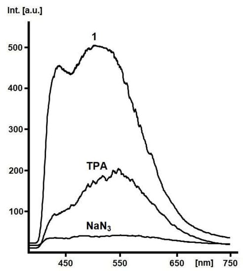 The photoluminescence emission spectra of solid samples of the title compound, free TPA and NaN3 are represented in Figure 4 (Perkin-Elmer Lamde LS55 spectrofluorometer, excitation at λex = 366 nm). Sodium azide shows very weak emission with a flat plateau from approx. 430–580 nm. The TPA ligand exhibits medium intense emission maximum at 548 nm and a shoulder at ~445 nm. The title complex 1 shows enhanced emission intensity with a maximum at 505 nm and a second maximum at 438 nm. The observed enhancement of luminescent intensity bands of complex 1 compared to the free TPA ligand is most likely attributed to the increased Cd-Npy bond strength, which effectively increases the rigidity of the ligand and hence reduces the non-radiative decay of the intra-ligand excited state.