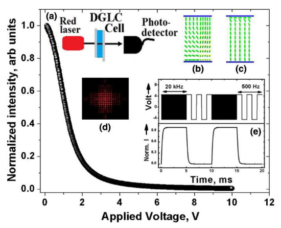 Figure 5), due to their different voltage-dependent transmittance and phase modulation. When a voltage was applied, four characteristic states were achieved and the intensity of 1st order could be suppressed by approximately 2 orders within 0.3 Vp-p at driving voltage < 2.5 Vp-p.