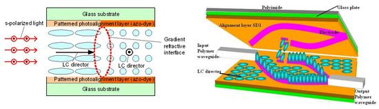 25]. The LC structure can be stabilized by the photoalignment layer without operation of applied voltage. S-polarized light can be coupled and comes from the waveguide, going into a collimated beam inside LC bulk for further processing, while the p-polarized light can be guided by matching polarization maintaining LC waveguide [