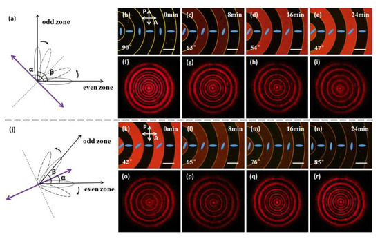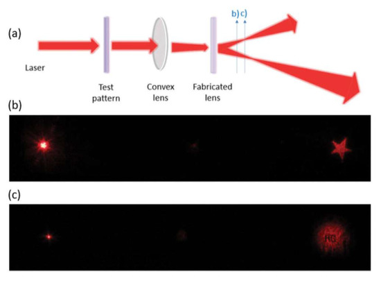 Figure 16). When a linearly polarized incident light successively passed through a conventional convex glass lens with a proper focal length and the fabricated lens, the two emergent light beams exhibited convergent optical behavior and the two focuses were spatially separated. Moreover, by adjusting the distance between the proposed lens and the conventional glass lens, the focal lengths of the lens system could be modulated.