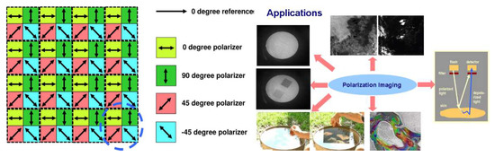 30]. This high resolution thin micro-polarizer arrays with a 5 μ × 5 μ pixel pitch and a thickness of 0.95 μ achieved by the “host” nematic liquid crystal molecules photo-aligned of sulfonic azo-dye SD1. The averaged major principal transmittance, polarization efficiency and order parameter are 80.3%, 86.3% and 84.8% respectively, across the 400–700 nm visible spectrum range. The proposed fabrication technology completely removes the need for any selective etching during the fabrication/integration process of the micro-polarizer array. It is fully CMOS compatible, and is simple and cost-effective, requiring only spin-coating followed by a single ultraviolet-exposure through a “photo-alignment master”. It is well suited for low cost polarization imaging applications.