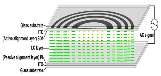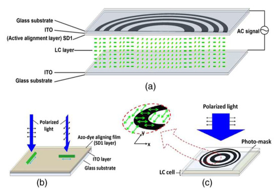 35]. The liquid crystal Fresnel lens was fabricated by assembling two glass substrates with different alignment materials. One substrate was coated with a homeotropic alignment layer and the other one was coated with an in-plane patterned alignment layer, wherein the easy axes in every two adjacent alignment domains were mutually orthogonal, as shown in