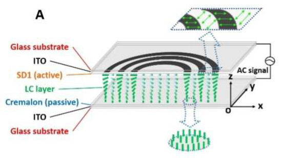 34] The binary-phase liquid crystal Fresnel lens manifested a diffraction efficiency of 39% at the focal point. Due to the mutually orthogonal alignment in neighboring domains (see