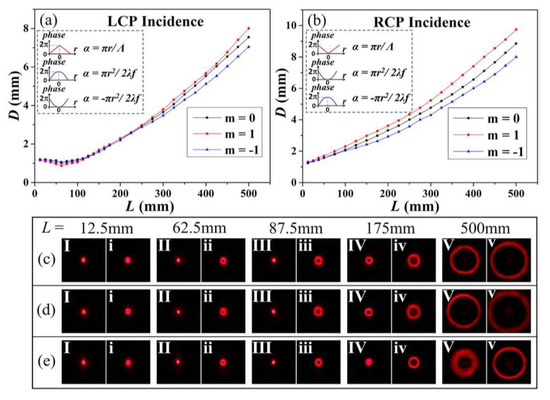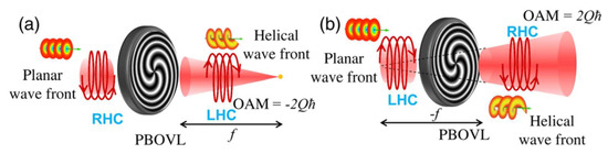 Figure 14. Different OAM states at the output of the PBOVL could be sorted by the bifocality of the fabricated lens. By using the underlying physics of the Pancharatnam-Berry-phase polarization holography, the device was facilely, efficiently, and economically realized. The transmittance and diffraction efficiency of the fabricated device were measured to be 90% and 91%, respectively.