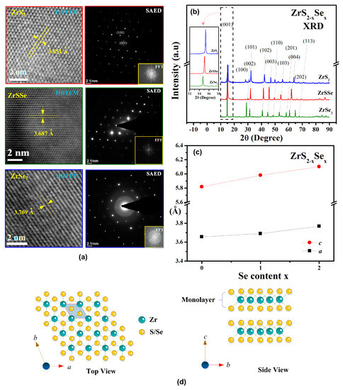(a) High-resolution transmission electron microscope (HRTEM) results, selected-area-electron-diffraction (SAED), and FFT images of ZrS2, ZrSSe, and ZrSe2. (b) XRD pattern of ZrS2−xSex (x = 0, 1, and 2). (c) Selenium doping effect on the variation of lattice constants a and c. (d) Atomic arrangements of layered ZrX2 (X = S, Se) observed from top view and side view.