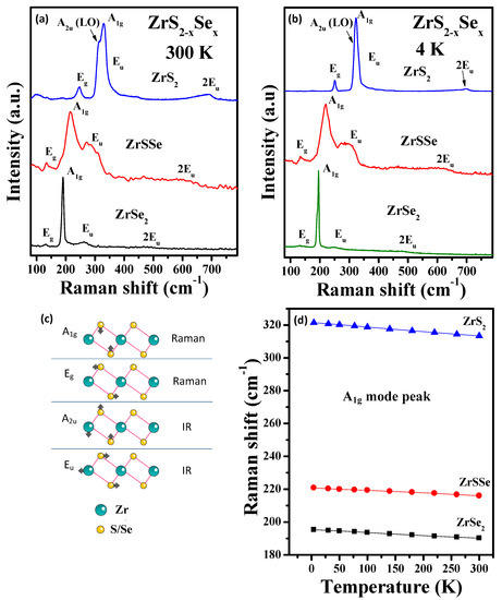 Raman spectra of ZrS2−xSex (x = 0, 1, and 2) at (a) 300 K and (b) 4 K. (c) The illustration of atomic movements of vibrational modes. (d) Raman frequency of A1g mode as a function of temperature in ZrS2−xSex (x = 0, 1, and 2).
