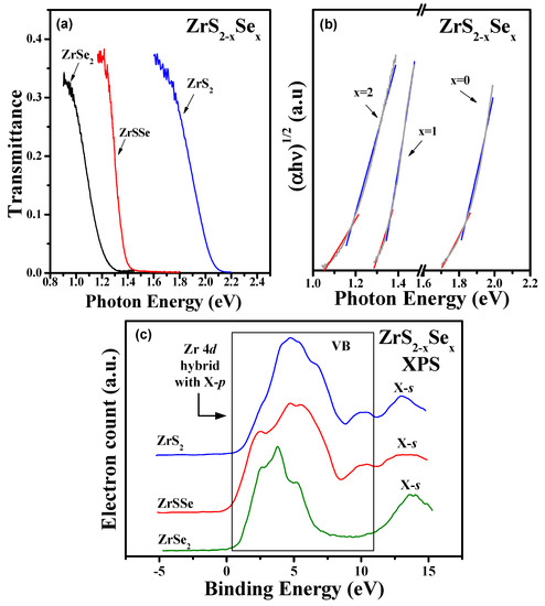- Moustafa, M.; Zandt, T.; Janowitz, C.; Manzke, R. Growth and Band Gap Determination of the ZrSxSe2−x Single Cystal Series. Phys. Rev. B 2009, 80, 035206. [Google Scholar] [CrossRef]