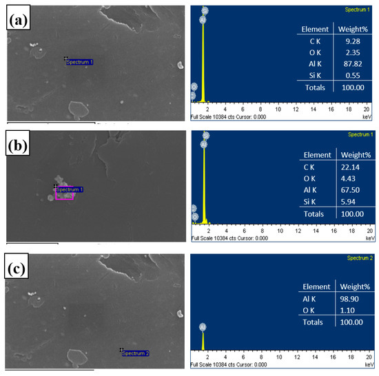 For confirmation of SiC nanoparticles in the powder mixture, Energy-dispersive X-ray spectroscopy (EDX) elemental analysis is presented in Figure 3. The analysis shows a high concentration of SiC content in Figure 3a,b for both point and area spots on the white particles respectively, which confirms that it is either single or agglomerated SiC particles. Meanwhile, it shows 0% SiC content when spotting on the pure Al areas as in Figure 3c.