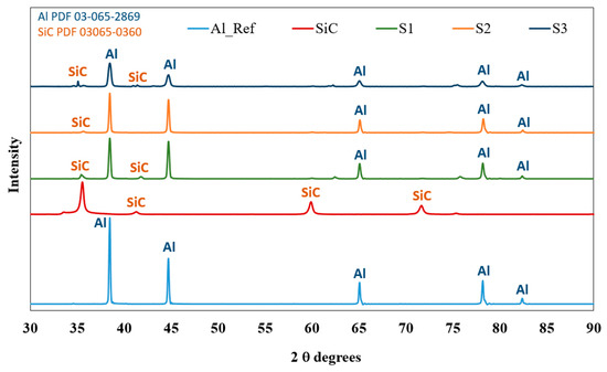 XRD analysis can be used to investigate the presence of SiC in the produced composites. Thus, the XRD patterns of the bulk composites by the three strategies have shown SiC peaks. Additionally, the Al peaks are broadened, and their intensities are diminished. Additionally, there is a detectable peak in S1 and S3 around 63 degrees, indicating the formation of Al2O3. This is attributed to the oxidation process taking place after the ball milling process. The absence of this peak in S2 is due to the lower energy at the last stage of this process in comparison with the other samples.