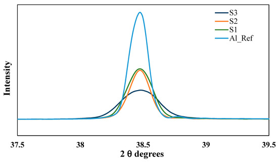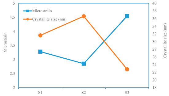 To compare the broadening of peaks and the diminishing in their intensities, Figure 6 is presented. This figure shows that the spectrum of S1 has a diminished intensity with a small broadening. Mostly, a similar behavior can be seen in S2. However, the S2 peak is slightly narrower than the peak of S1, which can be attributed to the increase of the crystallite size of S2 narrowing the peak width, and the higher porosity in the S2 narrowing the peak intensity. Additionally, the huge broadening and intensity diminishing among all three samples can be seen in S3. This indicates that S3 has the lowest crystallite size and the highest microstrain, as can be seen in Figure 6. Crystallite size and microstrain were calculated by obtaining and full width at half maximum (FWHM) directly from DIFFRAC.EVALUATION PACKAGE software. The crystallite size was then calculated using the following equation: