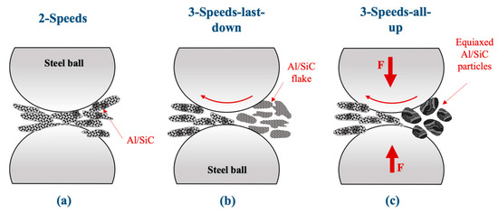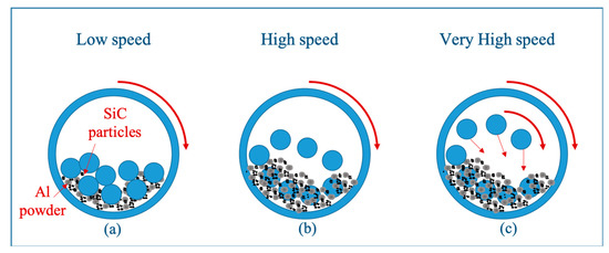 The morphology of the resultant ball-milled powder in the last stage of the first strategy, illustrated in Figure 8a, shows that the aluminum powders have converted into flake shapes and the reinforcements are distributed on top of them with low agglomeration. This is attributed to the type of motion during the ball milling process. In this strategy, the process includes two stages: low speed, followed by high speed, as schematically represented in Figure 9. In the first stage (low speed), the collisions are dominated by shearing force leading to the flattening of aluminum particles and distributing the reinforcements. This stage was studied in previous investigations and has been proven to produce flaky shape particles, allowing reinforcements to be distributed uniformly in the matrix powder [39]. In the second stage (high speed), the compressive force is increased leading to the incorporation of some reinforcement particles into these flakes, but some of them are not bonded enough.