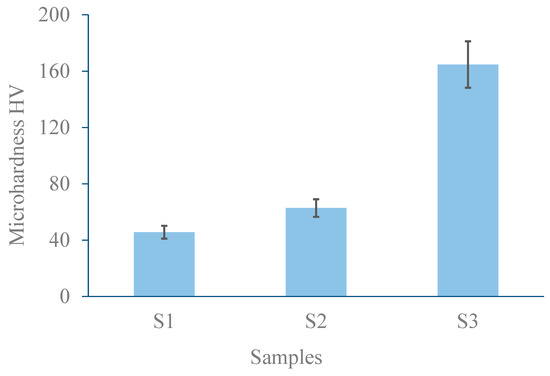 The microhardness of the consolidated samples was tested by the Vickers microhardness method and recorded. The average of three records for each sample is used and presented in Figure 10.