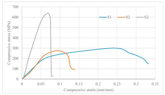 The analysis of the curves in Figure 11 has shown that S1 has the highest total compressive strain. This is attributed to the lower alloying time. S2, in contrast has both a lower compressive stress and strain. This is attributed to the long alloying time, increasing the brittleness. Additionally, the agglomeration of the reinforcement and lack of bonding lowered the strengthening. The S3 curve, in contrast, has a very high strength, reaching more than 200% of that of S1 samples. This is attributed to the effectiveness of the strategy, used to produce the composite of this sample, in increasing the strength of the composite to its highest possible value.