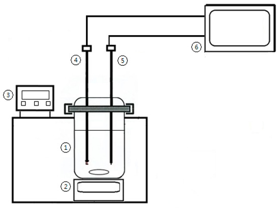 The experimental apparatus consisted of a 250 mL crystallizer immersed in a programmable thermostatic water bath, as shown in Figure 1. The crystallizer was equipped with a magnetic stirrer with a constant stirring rate of 350 rpm. Chemicals of analytical reagent grade purity were dissolved in the deionized water to prepare the desired solutions. The solutions were filtered through 0.45 µm pore filters before use.