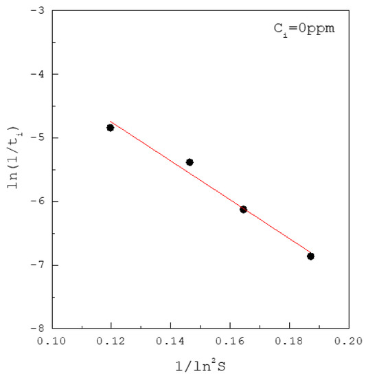 Figure 3 shows the induction time data of versus for the solutions without inhibitors at 37 °C fitted to Equation (4), leading to and . Based on , we can obtain . This value of is consistent with the values reported in the literature [25,33,34]. Generally, the higher the value of the interfacial energy, the more difficult it is for the solute to crystallize. It should be noted that and are determined first without the knowledge of . Consequently, is not influenced by the chosen value of although needs to be determined based on . For example, if the chosen value of is increased by ten times, is increased by ten times while remains unchanged.