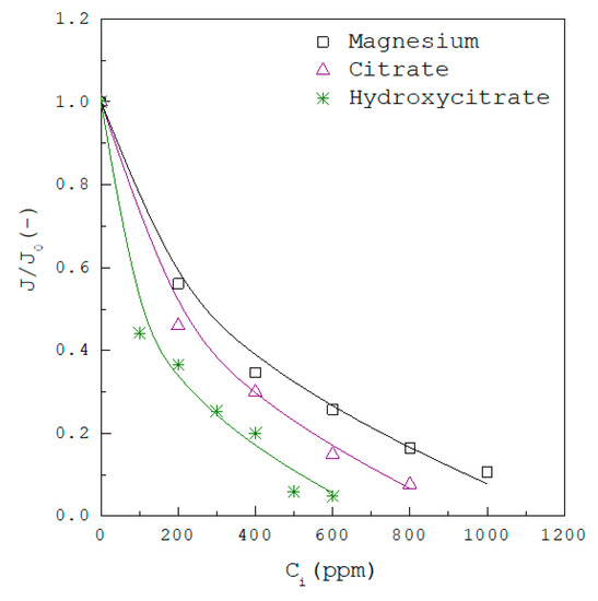 As compared in Figure 4, Figure 5 and Figure 6 for , the inhibition on nucleation rate of CaOx increases in the order magnesium < citrate < hydroxycitrate < chondroitin sulfate < phytate. For example, Figure 4 shows that the amount of inhibitor required to reach the inhibition of is 800 ppm magnesium, as opposed to 600 ppm citrate or 400 ppm hydroxycitrate. Figure 5 shows that the amount of chondroitin sulfate required to reach the inhibition of is 40 ppm. Figure 6 shows that the amount of phytate required to reach the inhibition of is 1 ppm. Although small amounts of phytate can significantly reduce the nucleation rate of CaOx, the ingestion of phytate may affect the bioavailability and levels of iron, zinc and calcium in humans [35].