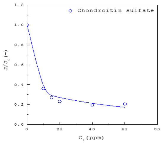 The decrease of with increasing inhibitor concentration for the solutions in the presence of chondroitin sulfate for at 37 °C. The solid line is a visual guide.