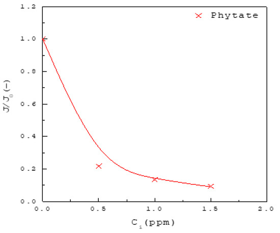The decrease of with increasing inhibitor concentration for the solutions in the presence of phytate for at 37 °C. The solid line is a visual guide.