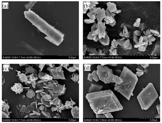 Figure 7 displays the polymorphic forms of CaOx crystals obtained under various conditions for using SEM. Based on the known morphologies of the different hydrates for CaOx crystals shown in Figure 8 [36], COM is formed without inhibitors (Figure 7a) and in the presence of 1000 ppm magnesium (Figure 7b). Note that, although COM is formed in the presence of 800 ppm citrate (Figure 7c), some crystals do not have the COM morphology, and at least one crystal has the COD morphology. The presence of 500 ppm hydroxycitrate (Figure 7d) can induce the formation of COT, while the presence of 1.5 ppm phytate (Figure 7e) or 20 ppm chondroitin sulfate (Figure 7f) can induce the formation of COD. As COM more easily forms urinary stones than COT or COD, hydroxycitrate, phytate and chondroitin sulfate can be used to inhibit the formation of COM.