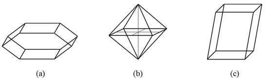 The morphologies of the different hydrates for CaOx crystals: (a) monoclinic prismatic monohydrate (COM); (b) tetragonal dipyramidal dihydrate (COD); (c) triclinic trihydrate (COT) [36].