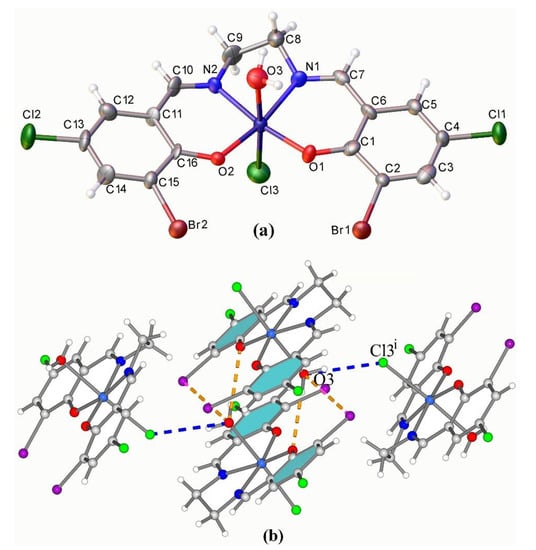 Initially, the studies on halogen bonds have been mainly focused on pure organic systems owing to the limited computational resources and ideal experimental models, few researchers have specially concern the electronic structure and topological properties of halogen bonds in metal complexes [20,21,22,23,24]. Recently, pioneer researches have looked at the methods for incorporating coordination polymers into X-bonded systems [25,26,27]. It was found that some ionic coordination complexes containing ionic inorganic ligands (e.g., Cl−, CN−, SCN− etc.) can be used as halogen bonding acceptors [28]. In some studies, metal complex cations can serve as charge-balanced objects in the framework of halogen bonds formed between halide anion and neutral X-bonded donor sites [10,29]. Whereas researches about other types of coordination polymers are still rather rare, Schiff base type complexes, as an important member of coordination family, have attracted much attention because of their unique structures and physicochemical properties [30,31]. Although the considerable progress that has been made in different frontier sciences, to the best of our knowledge, up to the present, still no work has specifically concerned the electronic configuration as well as the influence of halogen bonds on Schiff base complexes.