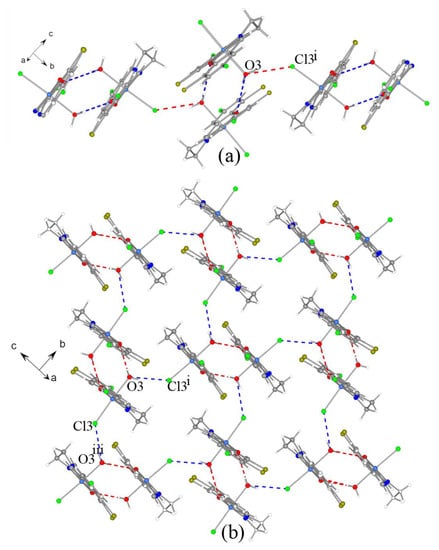 It is revealed by PLATON software that a self-assembled supramolecular dimer is built up of two adjacent monomers which are linked by π–π, O–H···O and O–H···Br intermolecular hydrogen interactions (see Figure 1b and Figure S1 (Supplementary Materials)) [40]. Then, the coordination oxygen atoms O(3) form intermolecular hydrogen bonds with the adjacent coordinated chlorine atom Cl(3)i [i: 1-x, 0.5+y, 1.5-z] which links the neighboring self-assembled supramolecular dimers to form a one-dimensional chain structure (Figure 1b and Figure 2a). In the bc plane, the 1D chains were further linked together through the O–H···Cl H-bonds (O(3)–H(3A)···Cl(3)iii [iii: 1-x, −0.5+y, 1.5-z]) to form supramolecular dimer 2D layers. Details of intermolecular hydrogen bonding interactions are given in Table 2.