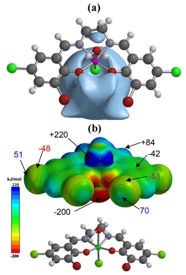 In order to evaluate the weak contacts and electrochemical reactivity of the title complex, ESP and MEP maps were created by using the B3LYP/6–311G level in ground state [43]. The region shown as convex surface that represents negative electrostatic potential, which wholly covers around the chlorine ligand (Cl(3)) (see Figure 5a), mostly covers phenoxo oxygen atoms (O(1) and O(2)), and partially covers bromine atoms (Br(1) and Br(2)) in a small semicircle region near the benzene ring, indicating the most highly negative sites are localized around the atoms. Noteworthy, compared with bromine atoms, the substitute chlorine atoms (Cl(1) and Cl(2)) on the benzene rings do not display a higher negative potential, similar results can be found in the molecular electrostatic potential (MEP) map.