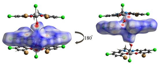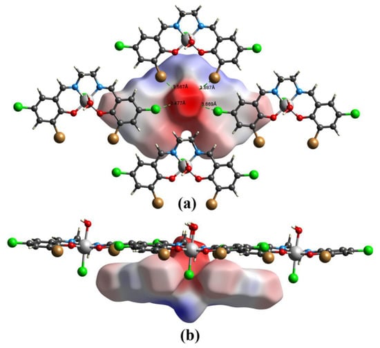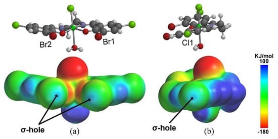 The MEP for the title compound is scaled from −200 kJ mol−1 to +220 kJ mol−1, and the quantitative molecular electrostatic potential surface is displayed with color: red indicates the negative regions and blue indicates the positive regions. As is shown in Figure 5b and Figure S3 (Supplementary Materials), the region around the halogen atom (Cl(3)) that coordinated to the Mn(III) center (−200 kJ·mol−1) exhibits the most highly negative electrostatic potential. Meanwhile, this region is also influenced by the phenoxo oxygen atom (−158 kJ·mol−1). Consequently, we can predict that the atom in the region acts as an electron donor in intermolecular interactions. The region of hydrogen atoms on the coordination water molecule (220 kJ·mol−1) and the amine group at the molecular plane (84 kJ·mol−1) exhibits the most highly positive electrostatic potential. Further study indicated that the bromine and chlorine atoms on the benzene rings present quite different values in different directions. More specifically, along the C-X bond axis, the MEP potential is positive, the MEP values for Br(1) and Cl(2) are calculated to be 70 kJ·mol−1 and 51 kJ·mol−1, respectively; whereas the potentials in the direction perpendicular to the axis are negative, that for Br(1) and Cl(2) to be −51 kJ·mol−1 and −48 kJ·mol−1, respectively. That is to say along C-X bond direction halogens is electrophilic (δ+) which can act as σ-hole to interact with negatively charged electrostatic nucleophile Figure 6. In addition, although Br atom is close to the most negative region(chlorine ligand and phenoxo oxygen atoms) of the whole molecule, the positive potential of Br along C-Br bond direction is still higher than that in the C-Cl direction of Cl atom. These observation show that the electrostatic potential distribution of halogen atoms on the salen type ligand is basically consistent with other types of halogenated organic compounds.