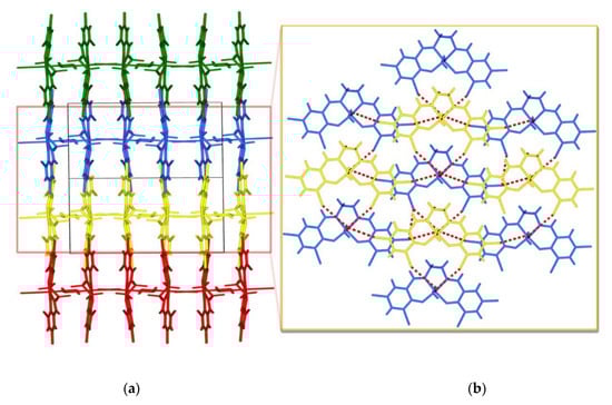 Herein we carried out the mapping of the electrostatic potential on Hirshfeld surfaces at the B3LYP/3–21G level of theory (see Figure 8) [45]. It is clearly shown that the chlorine ligands act as halogen bonding acceptors and link three adjacent molecules participating in the formation of halogen bonding. Although these molecules are arranged in different directions, all the C-X…Cl-Mn angles are close to 180° (Figure 8a, Figure S5 and Table S2 (Supplementary Materials)). Therefore, it is concluded that this is due to the key role of XBs that leads to the organization of the 2D layered sheets of 1 (Figure 8b). Furthermore, structural analyses show that 2D layered structures are bound to form a 3D supramolecular framework via multiply halogen bonding (Figure 9).