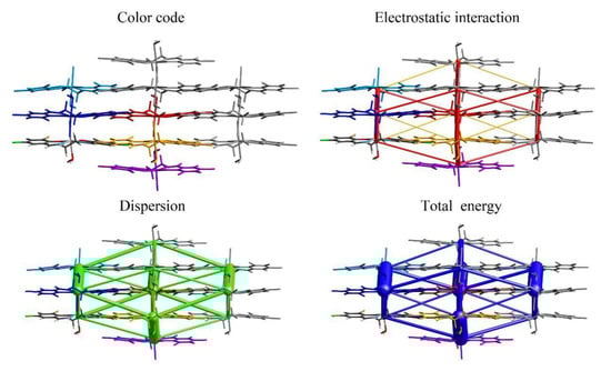 In this work, we used the CrystalExplorer software to calculate and display the interaction energy in a molecular crystal by using the B3LYP method with 3–21G basis set level [46]. Analyzing and quantifying intermolecular interactions in a crystal lattice, including repulsion, electrostatic, dispersion, and polarization etc., could help researchers gain an insight into the underlying interaction energy that happens and leads to the organization of crystal packing into supramolecular architectures in crystalline materials [47].
