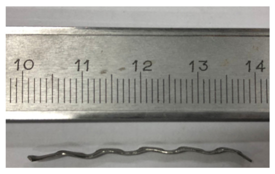 Continuously graded gravel with a size of 5–20 mm was used as the coarse aggregates. River sand with a fineness modulus of 2.94 was used as the fine aggregates. Steel fiber was produced by Zibo Shuanglian Building Materials co. LTD in China. The tensile strength of steel fiber was 520 MPa. The diameter of steel fiber was 0.58 mm and the length was 40 mm. Figure 2 shows the specific morphology of steel fiber, which is a wave shape. Table 2 shows the mix proportion of the concrete used in this paper.