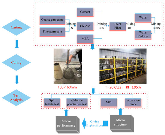 The specific process and analysis method of this paper are shown in Figure 3. Cube blocks of 150*150*150 mm were poured to study the split tensile strength and cylinder specimens of 10050 mm were poured to study the chloride diffusion resistance. After casting, the molds filled with fresh concrete were placed on the high-frequency vibration table to vibrate until no obvious bubbles escaped. After 24 h, the abrasives were removed and the concrete was transferred to the standard curing chamber ().