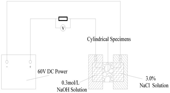 Normally, the main methods for measuring chloride diffusion resistance are slow method and fast method. Among them, the slow method is too time-consuming and seldom used in practice, while the fast method can measure the chloride diffusion resistance of materials in a short time. As the most typical of the rapid method, the electric flux method was first proposed by the Portland Cement Association of the United States in 1981 and has become the most widely used in the world. The principle of the method is to use the electric field to accelerate the ion transport. The ions penetrate through the specimen under the action of DC power. In this paper, the chloride diffusion resistance was evaluated by the flux transferred in accordance with the procedures described in ASTM C1202 [23]. The test device is shown in Figure 5.