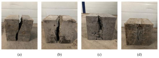 Failure pattern of concrete. (a) Reference concrete (RC); (b) MgO concrete (MC); (c) Steel fiber reinforced concrete (SFRC); (d) Steel fiber reinforced MgO concrete (SFRMC).