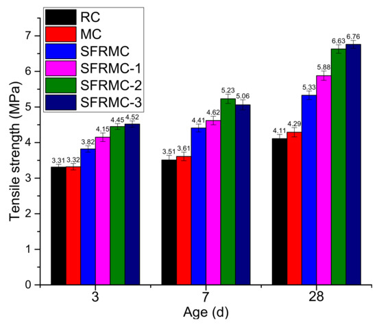 Figure 7 shows the split tensile strength of specimens with different mix proportions. Compared to RC, MgO had a small impact on the strength of MC in the early stage, but it had a greater impact on the strength in the later stage. At 28 days, the tensile strength of MC was 4.4% higher than that of RC, and the improvement was mainly due to the hydration of MgO. Compared to RC, the tensile strength of SFRC had been significantly improved. The strength had increased by 29.7% at 28 days, which was the result of the steel fiber restrained crack extension.