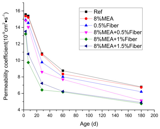 Table 3 shows the chloride diffusion coefficients (CDC) of concrete at 3, 7, 28, 60, and 180 days. As can be seen from Figure 8, with the increase in curing time, CDC of concrete with different mixing ratios gradually decreased, and the descending rate in the early stage (0–28 days) was relatively larger, while the rate in the later stage gradually decreased. The results showed that early curing of concrete had a significant effect on CDC. As the curing age increased, the cementitious materials continued to hydrate, the densification of concrete became higher, and the pores in concrete were gradually reduced, which was beneficial to reduce CDC and improve the durability. No matter how we changed the amount of fiber and MgO, the test results always obeyed this rule. Therefore, we suggest that in constructions, it is necessary to increase the time of early maintenance of concrete to improve the durability.