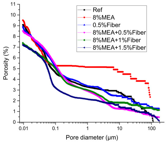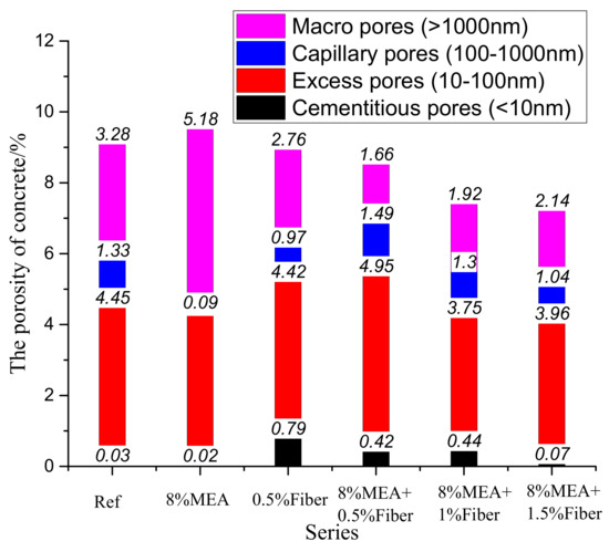 As an important part of concrete, the pore structure directly affected the mechanical properties and durability of concrete [24,25,26]. Therefore, the study on the effect of MgO and steel fiber on concrete is inseparable from the research on the pore structure. The pores can be classified into four categories: cementitious pores (<10 nm), transitional pores (10–100 nm), capillary pores (100–1000 nm), and macro pores (>1000 nm) [27]. Figure 9 shows the pore diameter distribution curve of concrete. Figure 10 shows the statistics of pore size.