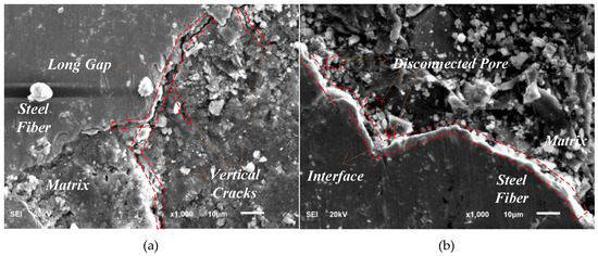 To further analyze the principle of performance increase of SFRMC, the microstructure of concrete, especially the interfacial transition zone (ITZ) between fiber and matrix, was explored. The microstructure of ITZ with different mix ratios is shown in Figure 11. Figure 11 shows that in SFRC, there were obvious long and wide gaps in ITZ due to the shrinkage of matrix. Besides, tensile stress was produced because steel fiber restricted the shrinkage of matrix. In addition, when the tensile stress was larger than the tensile strength of concrete, the vertical crack was produced, leading to a reduction in durability.