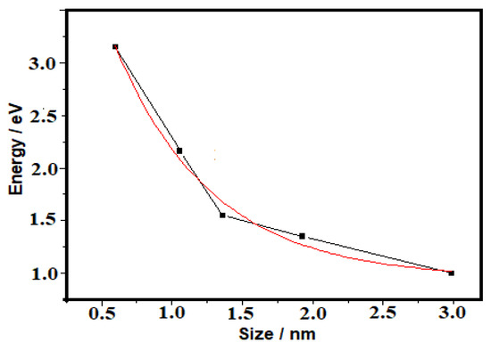 Change curve of bandgap energy with various diameter of Si NW, in which the black curve describes the simulating result and the red curve is fit one.