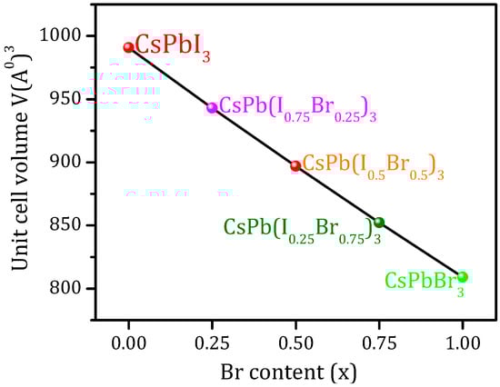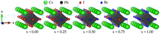 The crystal structures of cubic CsPbX3 with the atomic positions of Cs at (0, 0, 0), Pb at (0.5, 0.5, 0.5), and X at (0.5, 0.5, 0) within the space group were evaluated through these calculations. The CsPb(I1−xBrx)3 semiconductor compounds were modeled at the selected compositions with ordered structures of periodically repeating supercells 1 × 1 × 4 with 20 atoms per unit cell for x = 0.00, 0.25, 0.50, 0.75, and 1.00, as shown in Figure 1. See the Supplementary Materials, Tables S1–S5 for more details.