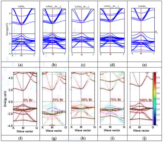 The folded band structure calculation for a 20-atom supercell of CsPb(I1−xBrx)3 represents a zone folding that hinders the analysis of the band structure of supercells, and the direct character of the folded band gap is obscured [46]. In order to recover the CsPb(I1−xBrx)3 band structure in its conventional Bloch representation, the SW approach was applied to unfold the electronic structure obtained from the framework of density functional theory, using the all-electron Wien2k package. The calculation of the SW is based on remapping the supercell reciprocal space with a mesh that is compatible with the translational symmetry of a primitive cell [46]. The unfolded band structure calculation for a 20-atom supercell 1 × 1 × 4 was calculated as shown in Figure 3f–j and can be directly compared to that in Figure 3a–e. The unfolded band structure for the pure supercell CsPbI3 is shown in Figure 3f. Due to the increases in the doping level of Br, the unfolded band structure becomes more obvious (Figure 3g–j). In another words, the colors in the conduction band minimum (CBM) and valence band maximum (VBM) change, which indicate the Bloch spectral weights as shown in the right axis of Figure 3. The SW is determined by both degeneracy and magnitude of the corresponding Bloch character [46,62,63,64].