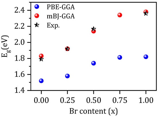 The substitution of bromide atoms at the iodide sites in the CsPbI3 compound provided a direct band gap character (M → M). The overall behavior of the folded band structures calculated by these two approximations was similar, except for the value of Eg, which was higher for the mBJ-GGA method, as listed in Table 2. The calculated Eg of CsPb(I1−xBrx)3, using the mBJ-GGA method, agreed with the experimental values, as listed in Table 2 and shown in Figure 4. Therefore, it could be concluded that the mBJ-GGA potential presents a good approach for calculating the electronic properties for a wide range of materials, such as wide-band-gap insulators, semiconductors, and three-dimensional transition-metal oxides, particularly their band gaps [24,45,59,60,61].